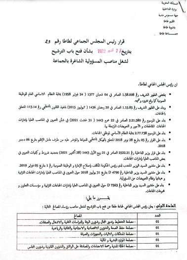 فتح باب الترشيح لشغل مناصب المسؤولية الشاغرة بالجماعة